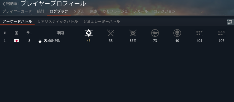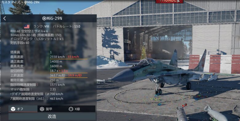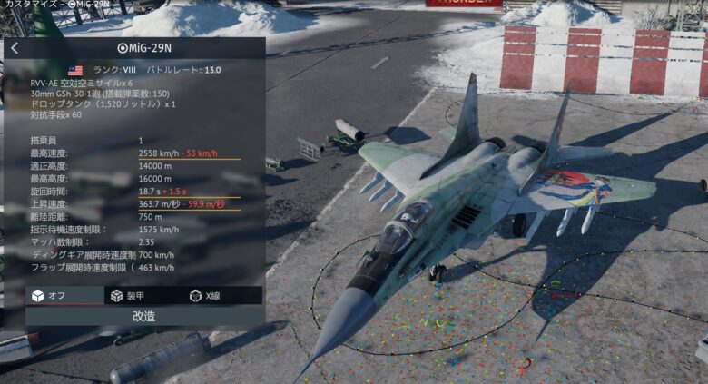 チャフとフレアが60発とやや心もとないですが、やられる前にやる、退く時は退く、常に1050km以上の速度を維持する等、堅実に戦えばなかなか落とされません。良くマッチする13.3のsu-33とか、新機体の課金スホーイ系には少し注意は必要ですが…