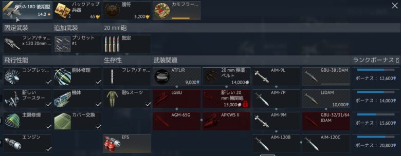 14.0のBR帯は13.7にデッキ調整してもボトムになる確率が高く、機体性能で大きく劣るF/A18は非常に活躍しにくいですが、かっこいいのでとりあえず改修します◎